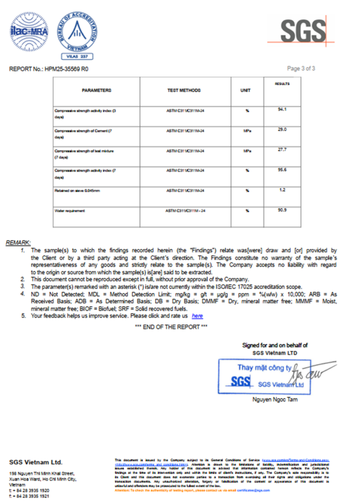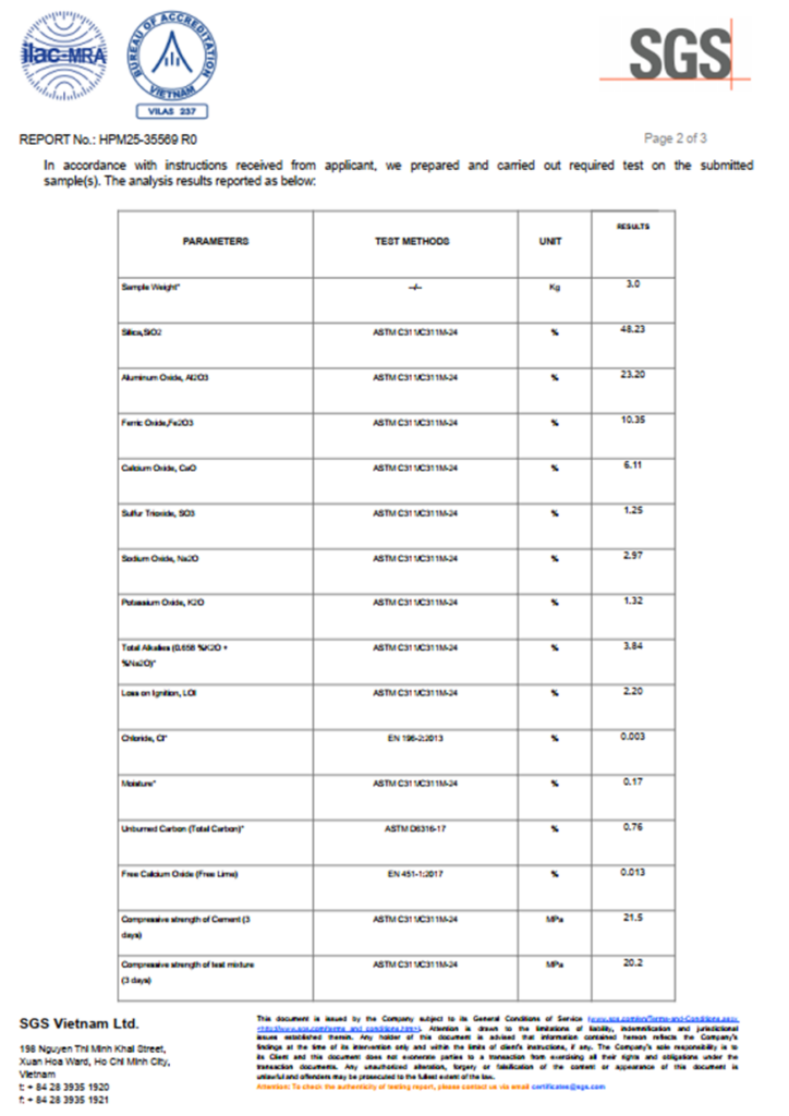 | SO₃ | < 2 | Theo giới hạn ASTM C618 | ≤ 5.0% | ≤ 3,0% | ≤ 3,5% |